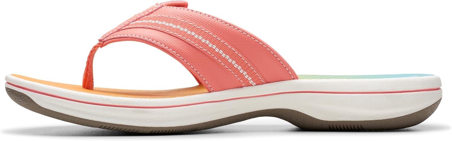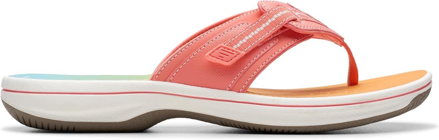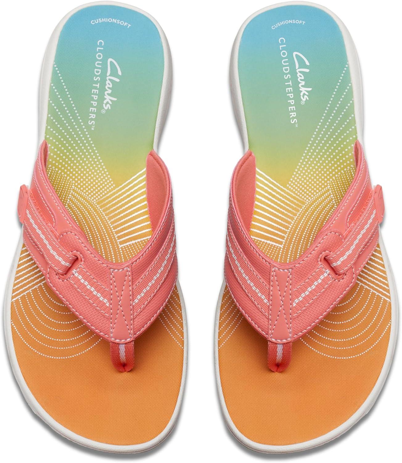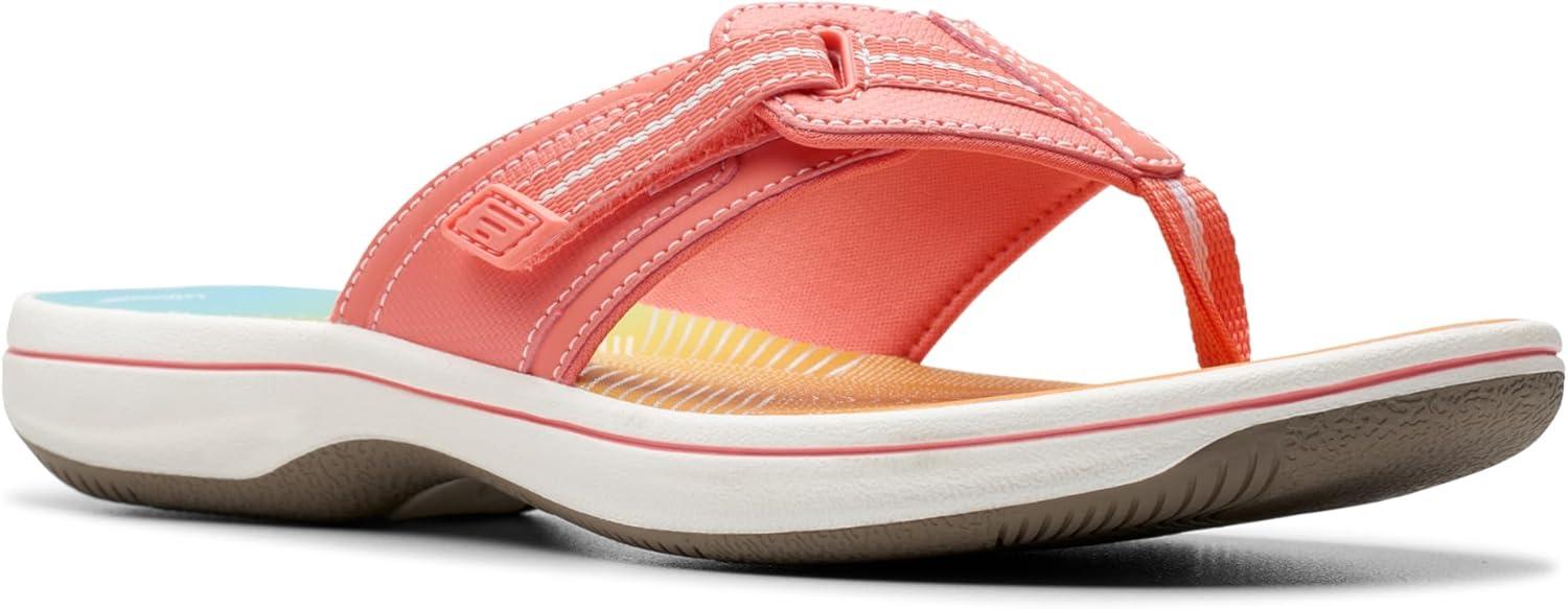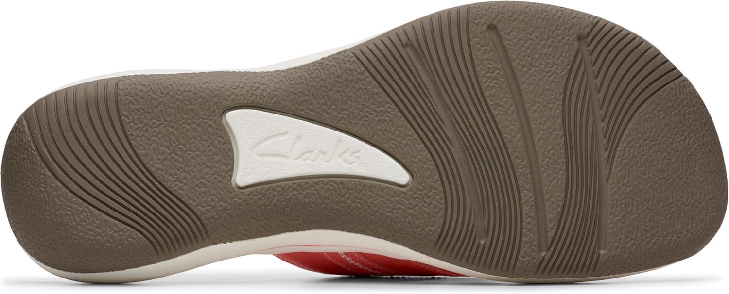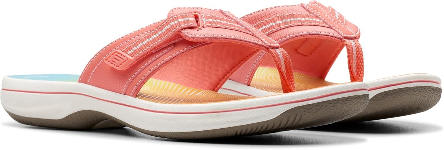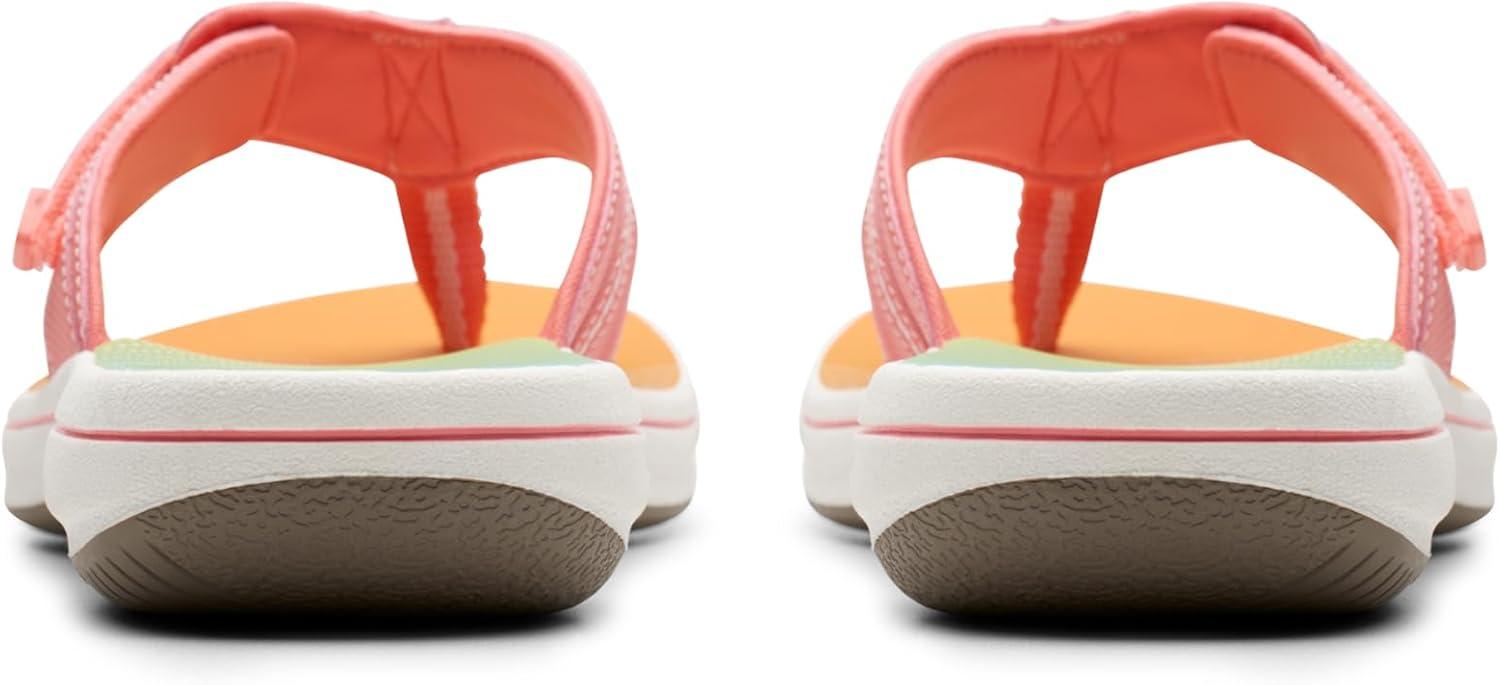 Choose this comfy flip-flop from the clarks collection for truly carefree summer dressing. offered in an array of colors with adjustable hook-and-loop closure, synthetic linings, printed eva footbed, and rubber outsole, this women's sandal brings a fun, beachy vibe to everyday wear.