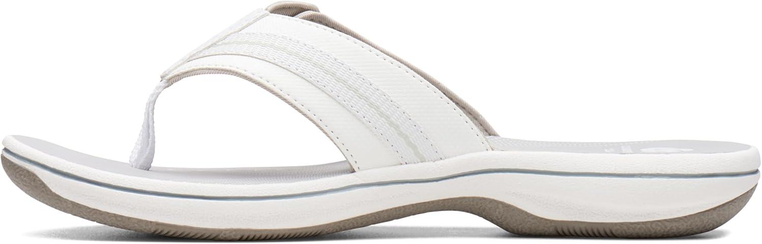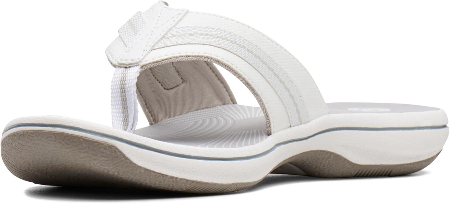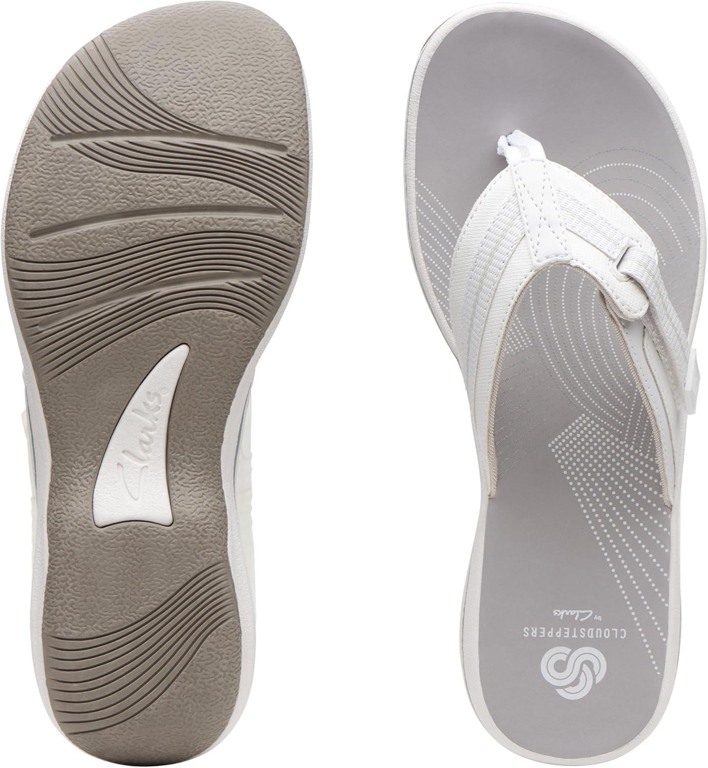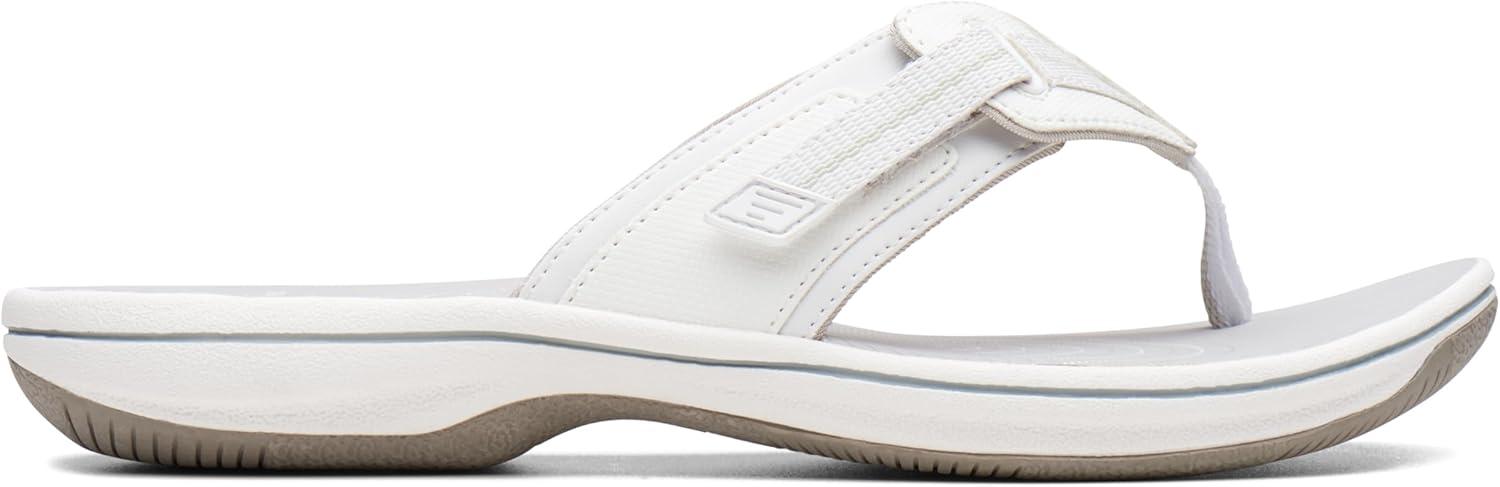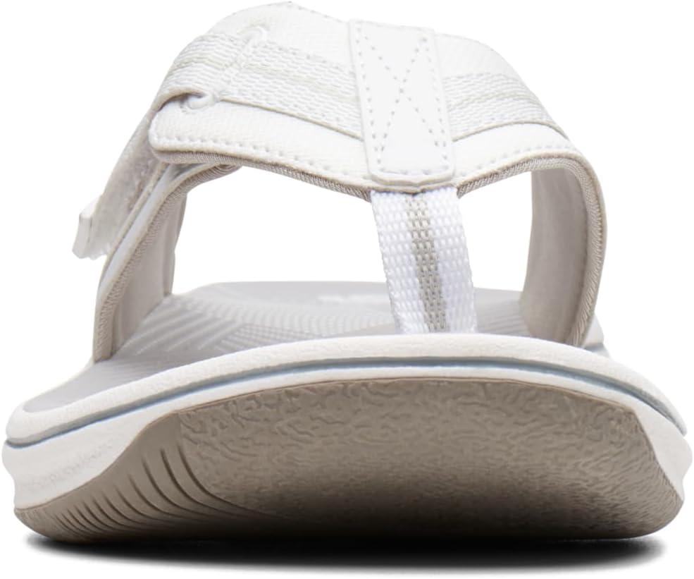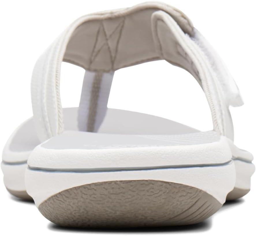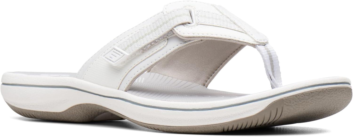 Choose this comfy flip-flop from the clarks collection for truly carefree summer dressing. offered in an array of colors with adjustable hook-and-loop closure, synthetic linings, printed eva footbed, and rubber outsole, this women's sandal brings a fun, beachy vibe to everyday wear.